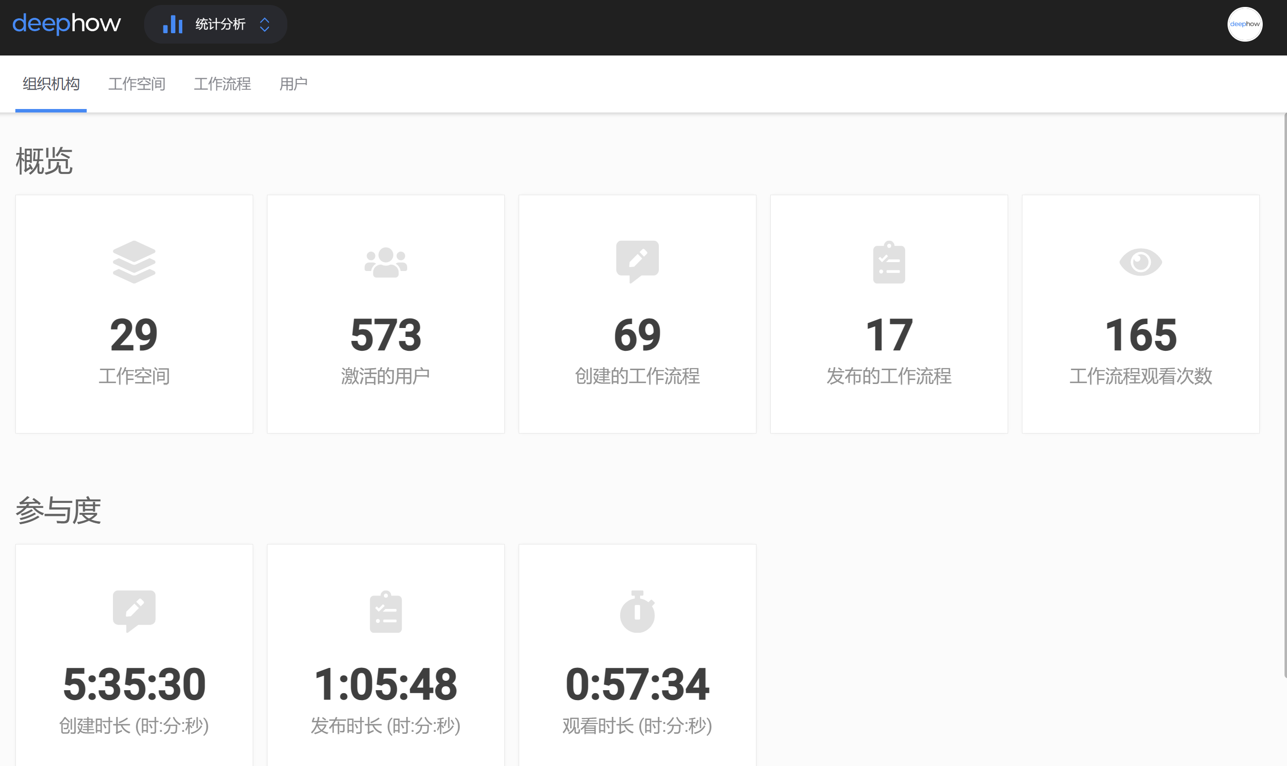 1.您可以在统计模块-组织机构中查看概览,包括工作空间数量、激活用户数、创建的工作流程、发布的工作流程、工作流程观看次数以及参与度的概览。